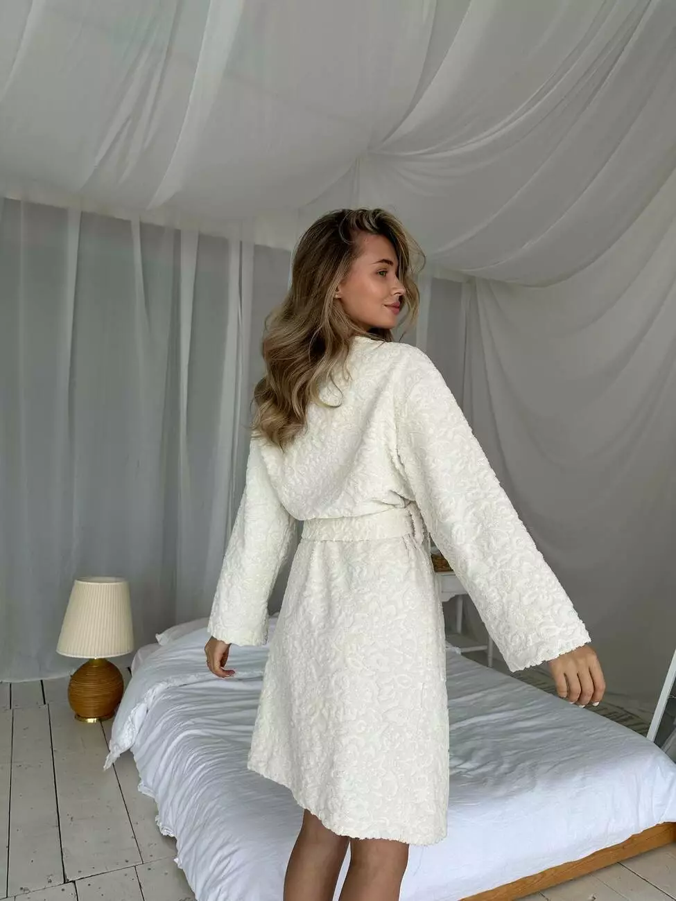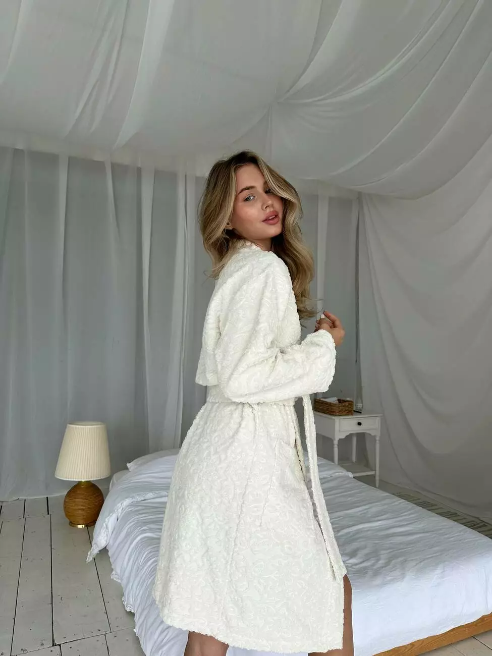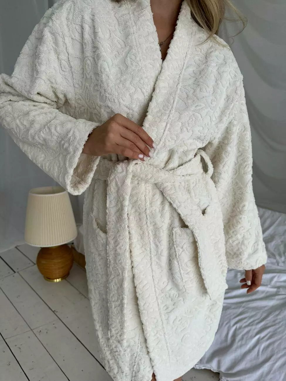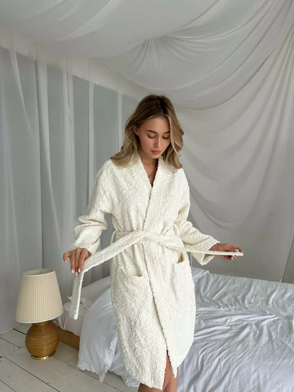 Окремої уваги заслуговує витончений жакардовий малюнок, що нагадує чарівні квіти. Ці хитромудрі візерунки не тільки додають текстурної глибини, але й роблять халат справжнім твором мистецтва.