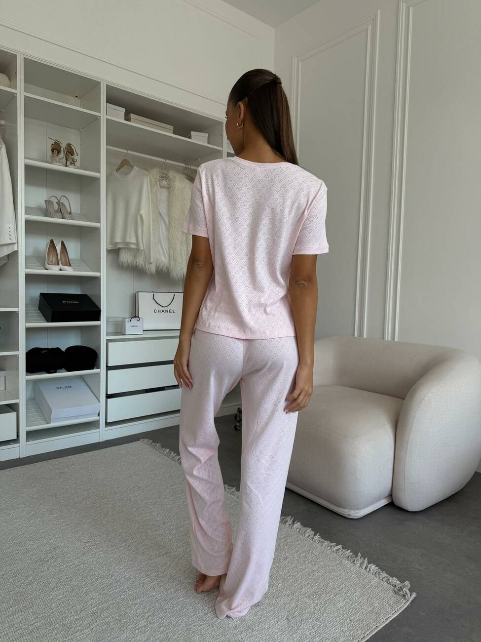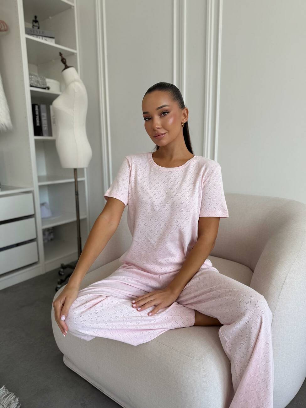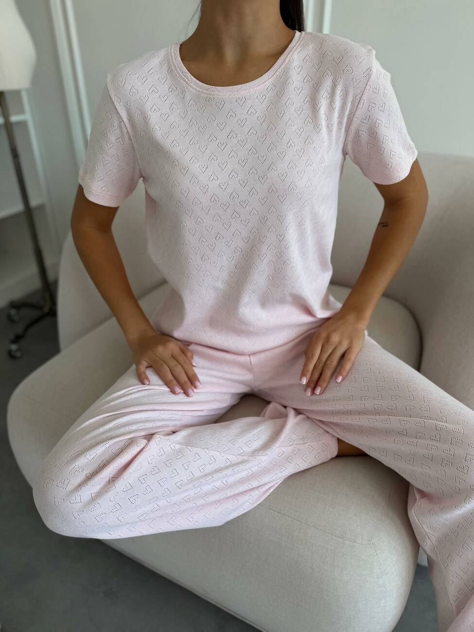 Комплект штани з футболкою «Rose Amour» з трансферної рібани Легкий, ніжний та зручний — створений для гармонійного відпочинку та сну. Футболка з коротким рукавом підкреслює жіночність завдяки витонченому пробитому візерунку на тканині, а вільні штани з м’яким поясом забезпечують комфорт і свободу рухів. Ніжно-рожевий колір у поєднанні з дрібними сердечками дарує романтичний настрій і відчуття затишку. Матеріал — 100% бавовна (трансферна рібана): приємна до тіла, дихає та зберігає відчуття легкості протягом усього дня. Комплект «Rose Amour» — для солодких снів, спокійних ранків і вечорів у колі домашнього тепла. Довжина: - футболка: 55-58 см - штани: 106 см
