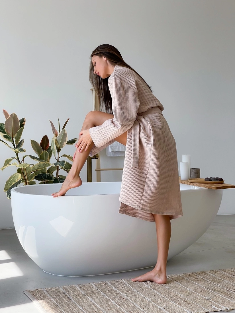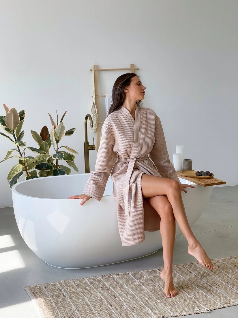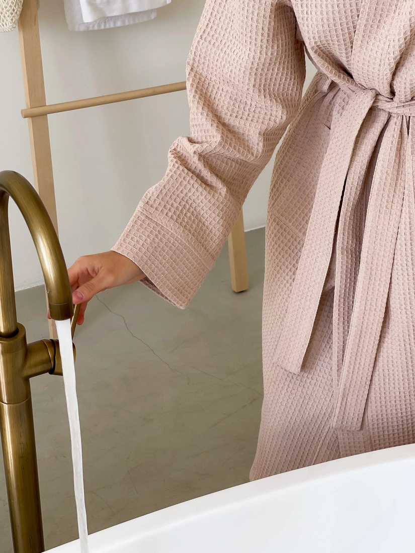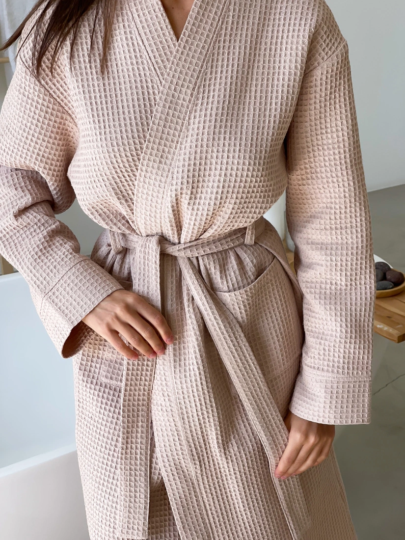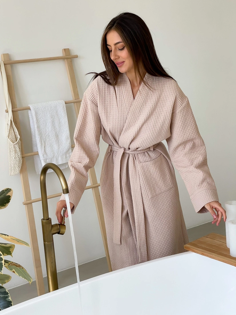 Завдяки своїй м'якості та унікальній здатності поглинати вологу вафельна тканина є однією з найпопулярніших серед бавовняних тканин. Зручний довгий халат незамінна річ у вашому гардеробі